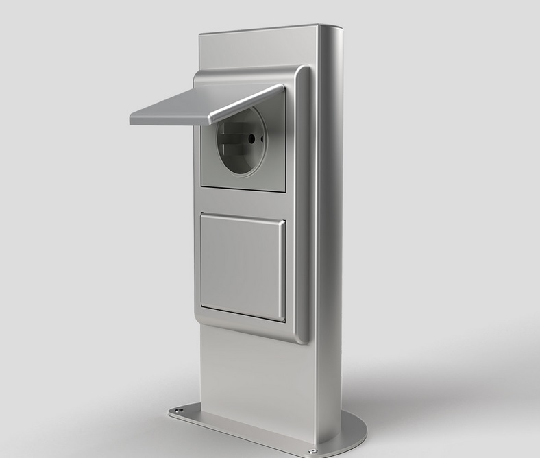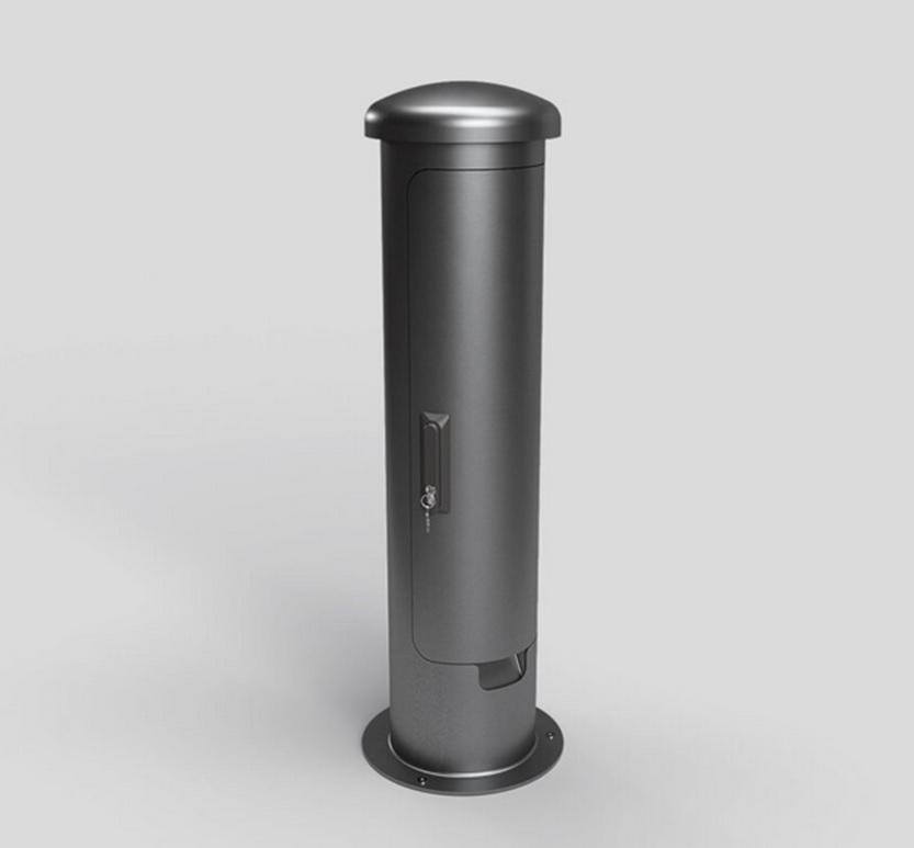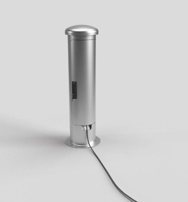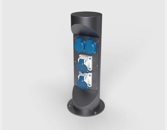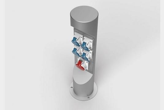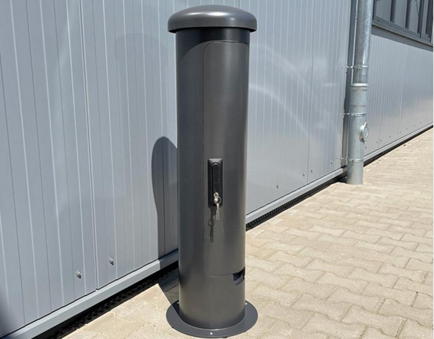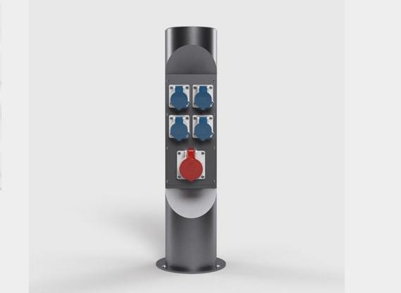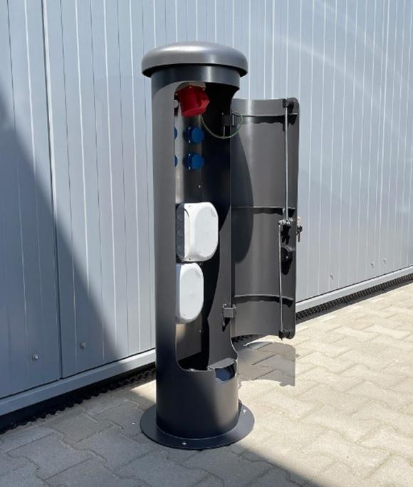 Energetický sloupek pro venkovní instalaci. Přívod zespoda. Sloupek lze zavřít a uzamčít i při používání a zapojení kabelů.