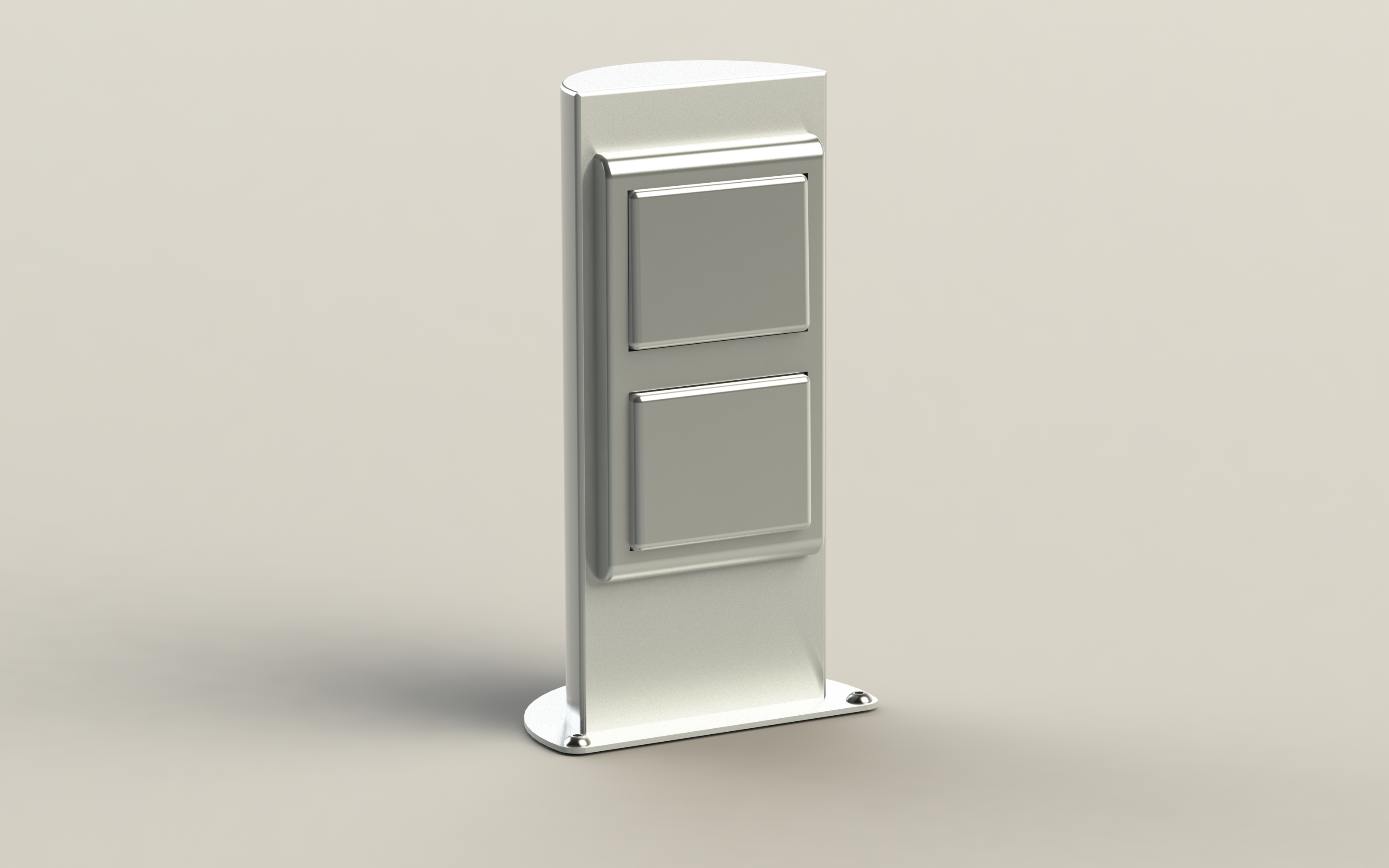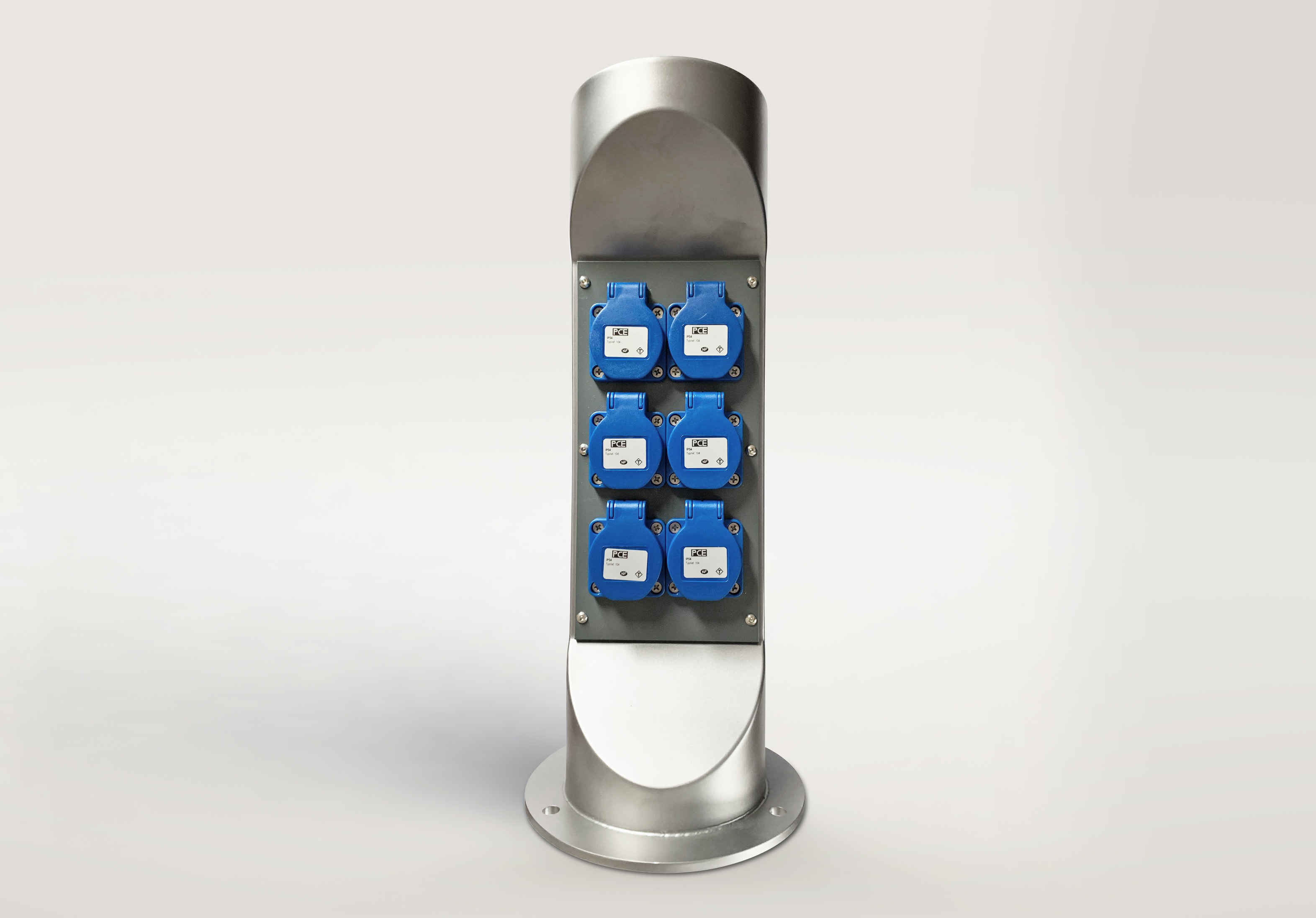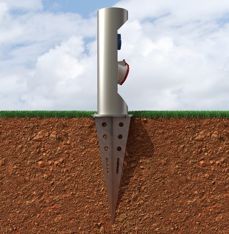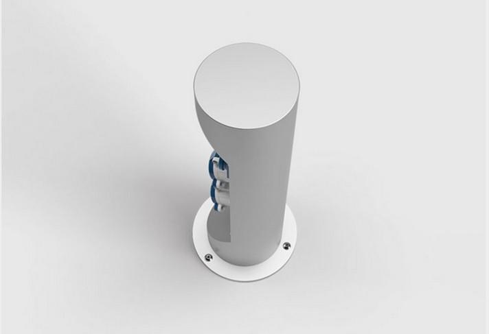 Energetický sloupek pro venkovní instalaci. Přívod zespoda. Sloupek lze zavřít a uzamčít i při používání a zapojení kabelů.
