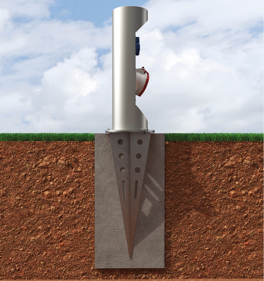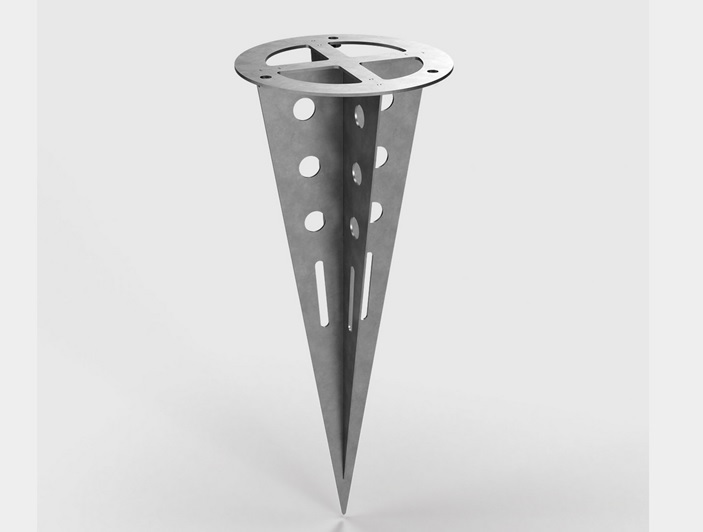 Masivní podstavec/kotva z nerezové oceli (povrch je pískovaný) pro upevnění el.sloupku ve volném terénu (hlína, štěrk apod.). Možnost i zabetonovat.
